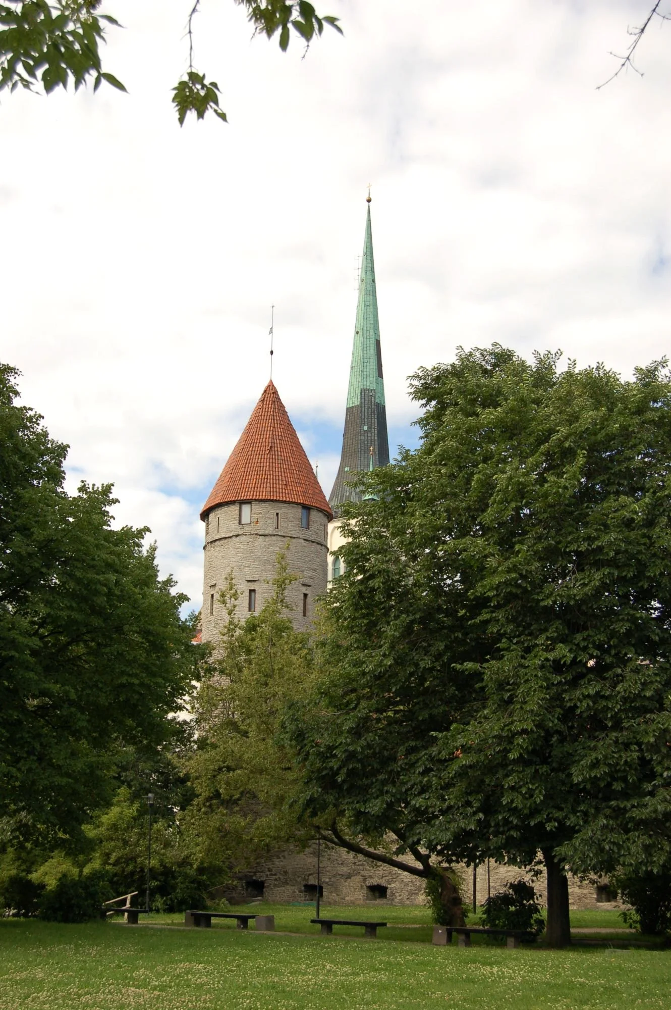 The St. Olaf’s Church stands behind the medieval castle tower and wall. Built in 1267.