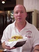 The condiments and sauces were in a large cow trough in the lobby. It was stocked with all the grazing material: lettuce, tomatoes, onions, jalapeños, and pickles. Also provided were squirt jugs of catsup, mustard, mayo, BBQ sauce, nacho cheese, and salsa. As an expert in eating and tasting, but not in cooking or preparing, I squirted too much sauce on my tasteless burger and even more on my hands, with a squirt or two on my size 11 Bruno Maglis. While the quality of these condiments was good, I did not pay $6.15 to make it myself.