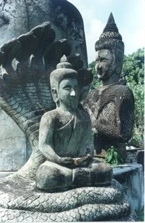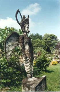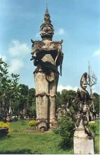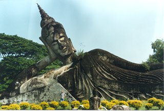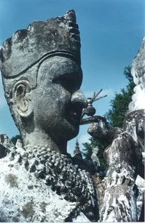 In Buddha Park outside of the capital, Vientiane. Over 200 concrete statues of the Buddha in one park. I am dwarfed by the size of this reclining Buddha