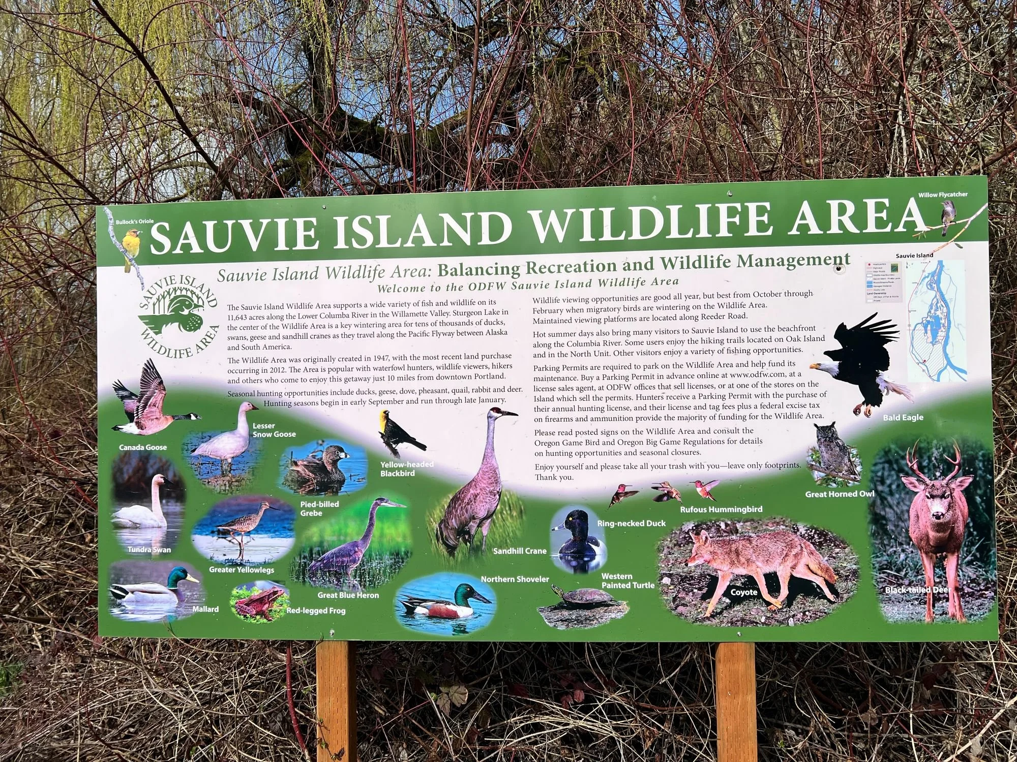 Much of the island is protected within the Sauvie Island Wildlife Area, a large habitat that supports migratory birds, waterfowl, deer, and other wildlife. Birdwatchers often visit during migration seasons to see thousands of geese, ducks, and sandhill cranes.