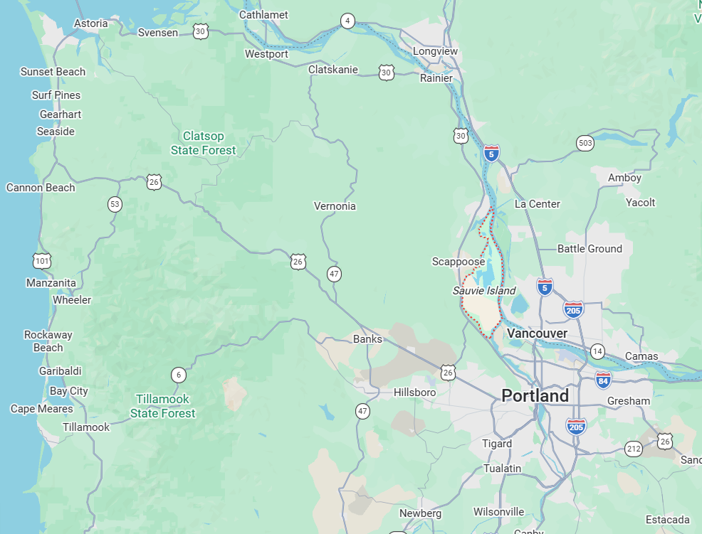 The island sits between the Willamette and Columbia Rivers